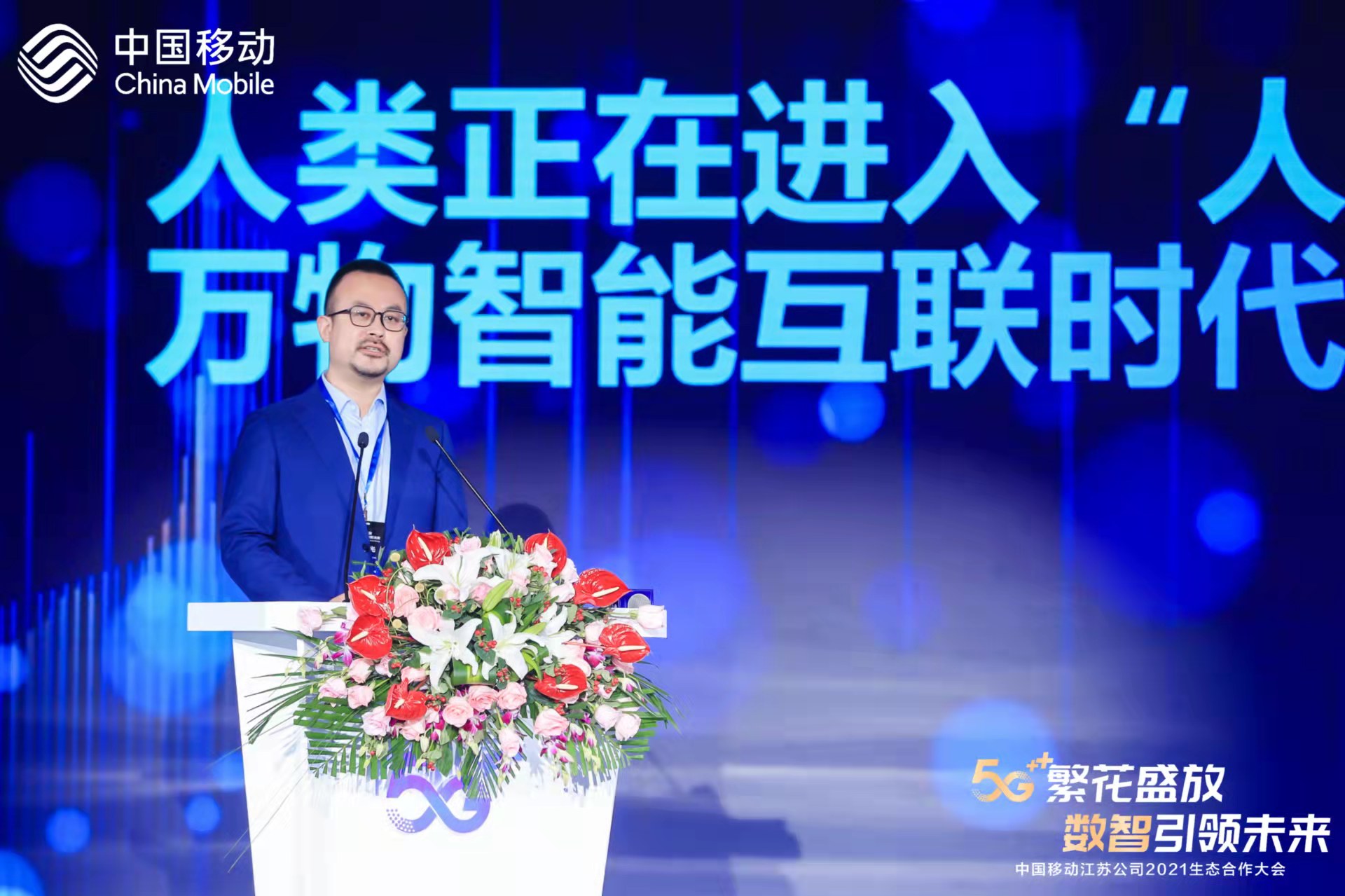在致辞环节,江苏移动总经理周毅总结了江苏移动在5G建设、运营及政企数智化转型方面取得的成果,对行业未来广阔的市场空间进行了展望,并邀请合作伙伴与江苏移动一起做大5G终端、数智化生活的市场空间,携手加快家庭HDICT、政企“网+云+DICT”的转型布局,共同推进算了网络、智慧中台的能力建设。
