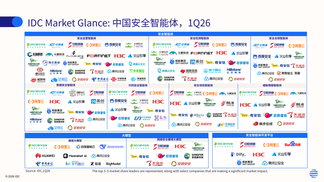 与此同时,大模型、智能体的安全检测与防护也少不了AI的赋能即安全智能体的加持。当前众多技术服务提供商已经将安全智能体和智能体集群的能力集成到其安全解决方案中,帮助用户提质增效,用AI对抗AI、AI防护AI将成为未来大模型安全、智能体安全防护的一个重要思路与能力。IDC同期发布《IDC MarketGlance:中国安全智能体,2026Q1》(Doc#CHC53597826),希望通过IDC对于中国市场中安全智能体产品的调研来帮助用户充分地了解安全智能体相关技术的发展和市场格局,详见下图:
