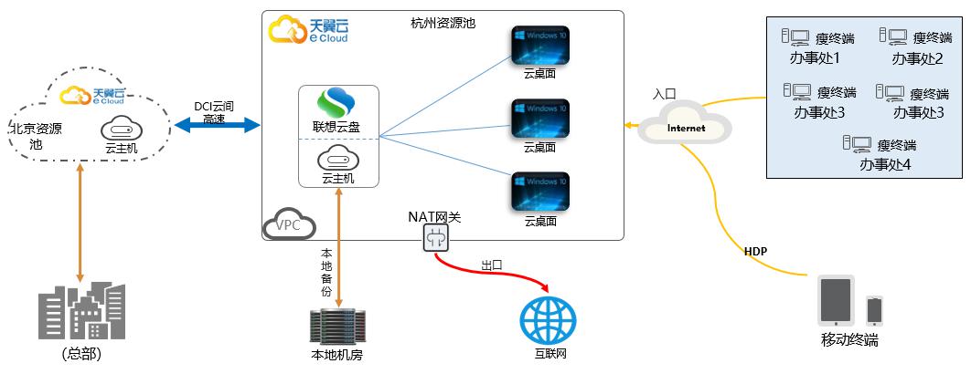杭州资源池部署云桌面替换本地办公电脑,一台云主机部署联想企业云盘用以存储日常办公数据;云桌面通过云间高速到北京资源池主机,通过云主机访问到企业北京总部机房的业务系统(erp、oa等)。