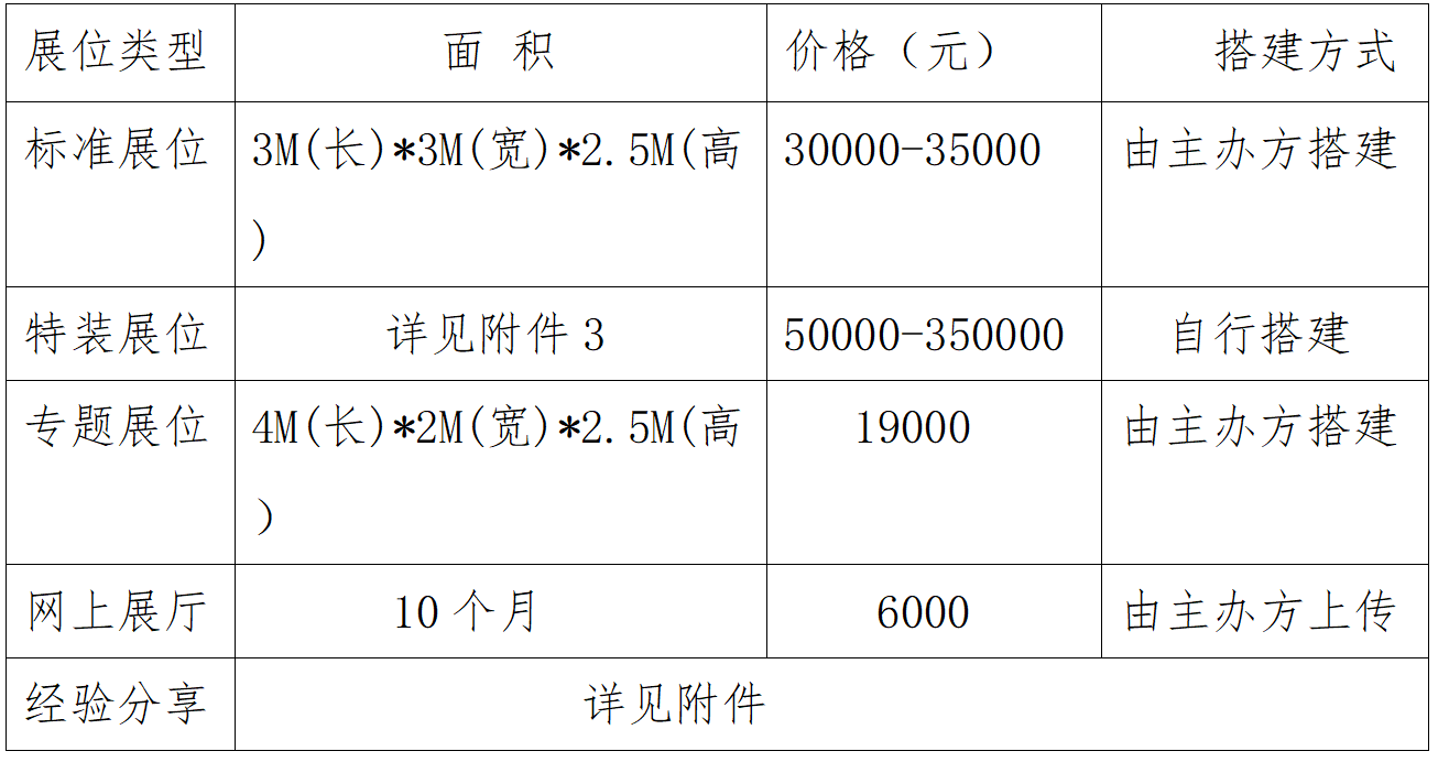 说明:标准展位9 M²(3*3),包括三面展板、一张洽谈桌、两把椅子、两支射灯、一个220V*5A电源插座、地毯(需向主办单位提供展位楣板文字,参加线下展赠送网上展)。
