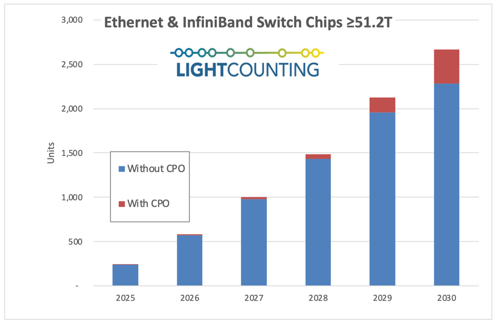在2025年至2030年间,以太网交换芯片的销售额将以43%的年复合增长率增长,其中包含了CPO带来的价值。此前,由于LPO在单通道100G光模块上已能提供类似的功耗节省效果,CPO的采用有所推迟。