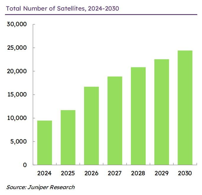 图:204-2030年卫星总数量。资料来源:Juniper Research。