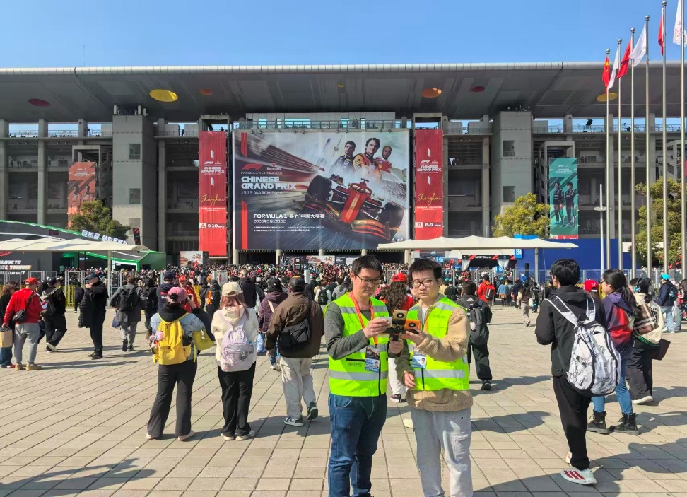 工作人员在F1主看台上进行直播业务测试