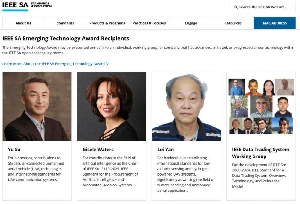 IEEE,即电气电子工程师学会,是世界最大的专业学术组织,也是全球最重要的技术标准制定机构之一。IEEE新兴技术奖旨在表彰通过标准化工作对技术格局和社会进步产生深远影响的创新技术。奖项由IEEE内部专家推选,对本年度在全球标准工作中做出杰出贡献的2-3名个人或集体进行授奖。本次苏郁因在5G联网无人机技术及无人机通信系统的国际标准方面做出了开创性贡献(For pioneering contributions to 5G cellular-connected unmanned aerial vehicle technologies and international standards for UAV communication systems)而荣获该奖项。