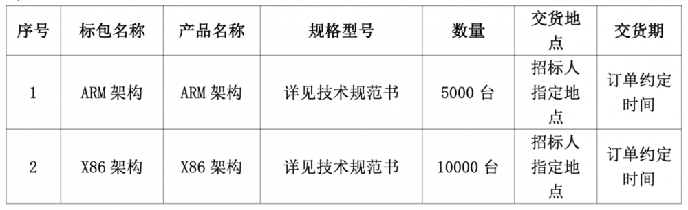 本项目分为两个标包,标包1:ARM架构、标包2:X86架构,共计15000台。公告称,允许投标人同时中标的最多标包数为2个。