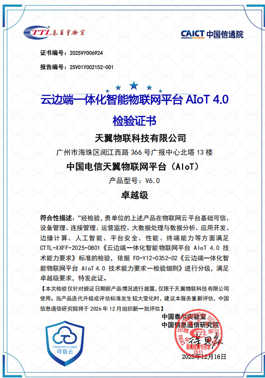 作为国内权威的AIoT平台评估体系,中国信通院“智能物联网4.0”评估,重点围绕平台能力建设成熟度、物联网人工智能服务和智能体应用能力、场景化服务能力等开展,细分指标超千项,评估结果分基础、增强及卓越级,全面衡量平台技术成熟度、应用成效与行业竞争力,为政府支撑、行业规范、用户选型和价值评价提供重要参考。此次评估,天翼物联网平台(AIoT)在云边端一体化、数字孪生、人工智能服务成熟度及多模态智能感知融合中,获卓越级评价。