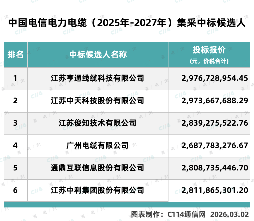 C114讯 3月2日消息(水易)来自中国电信阳光采购网消息,中国电信电力电缆(2025年-2027年)集中采购项目已完成评审。根据评审寄过,亨通、中天等7家厂商入围。