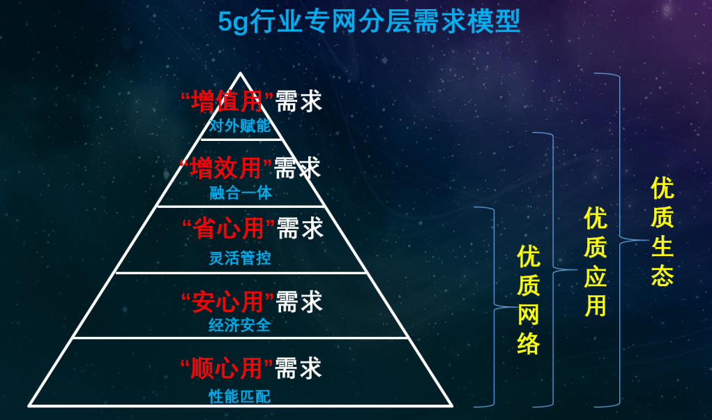 黄宇红表示,与人的马斯洛需求模型对应,5G行业专网需求可分为“顺心用”、“安心用”、“省心用”、“增效用”、“增值用”五层,其中“顺心用”要求5G覆盖、速率、时延、可靠性等网络性能匹配业务需求,是行业最基础的需求,需按需引入大上行、URLLC等增强技术;“安心用”要求网络安全可靠且经济性好;“省心用”要求网络可灵活管控;“增效用”要求5G网络与其它制式网络、系统、云和业务等有机融合,协同优化,提升企业整体业务效率;增值用要求5G相关能力能与企业业务能力整合,并统一对外赋能,助力企业构建全新业务生态。五层需求由优质网络到优质应用再到优质生态,由内部增效到外部增值,层层递进,逐步深化。
