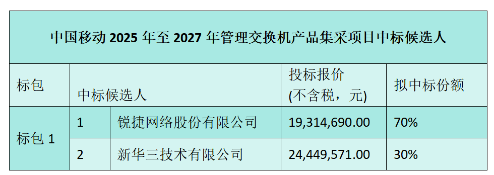 中国移动管理交换机产品集采:锐捷网络和新华三中标1/7
