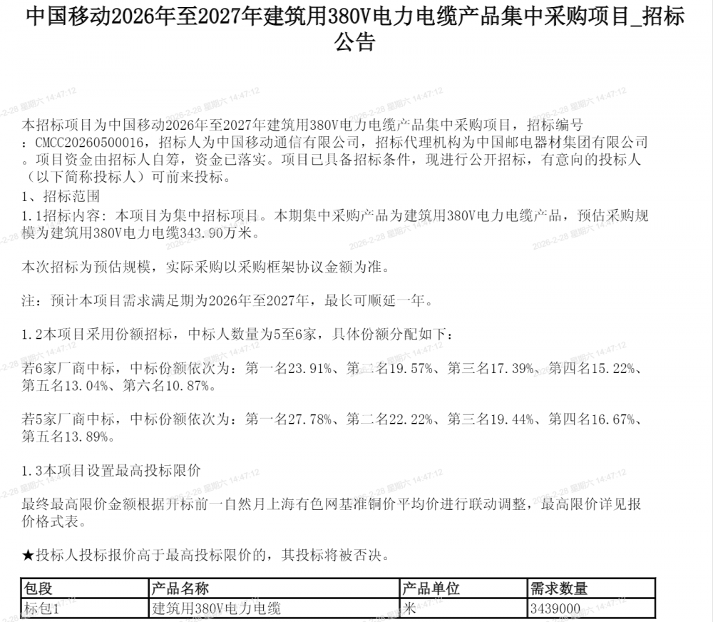 C114讯 2月28日消息(兰茜)中国移动采购与招标网日前发布2026年至2027年建筑用380V电力电缆产品集中采购项目招标公告,集中采购建筑用380V电力电缆产品,预估采购规模为建筑用380V电力电缆343.90万米。