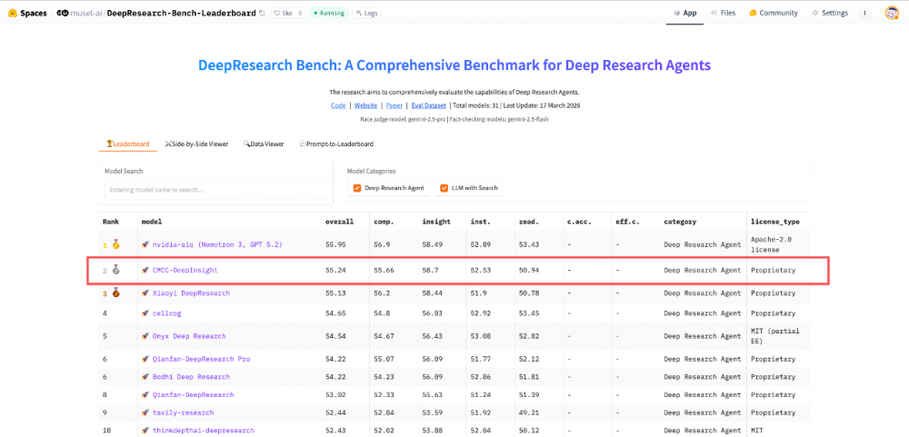 近日,在全球权威的AI深度研究评测基准DeepResearch Bench榜单中,中国移动自主研发的九天DeepInsight深度研究智能体成绩卓越,跻身全球第二,国内第一,充分印证了中国移动在复杂研究与深度报告生成领域的技术领先实力。