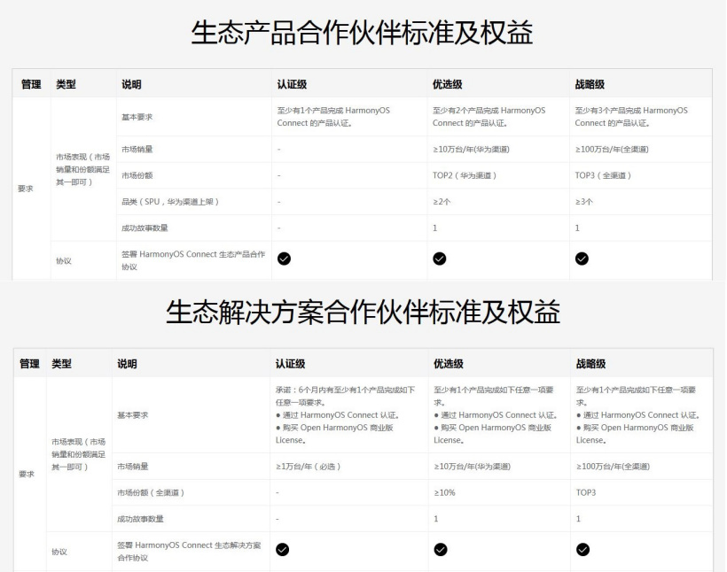 据悉,华为合作伙伴分为生态产品合作伙伴以及生态解决方案合作伙伴,包括认证级、优选级、战略级三类标准。