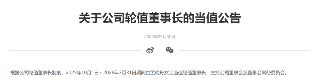 9月30日,华为官网显示,根据公司轮值董事长制度,2025年10月1日~2026年3月31日期间由孟晚舟女士当值轮值董事长,主持公司董事会及董事会常务委员会。
