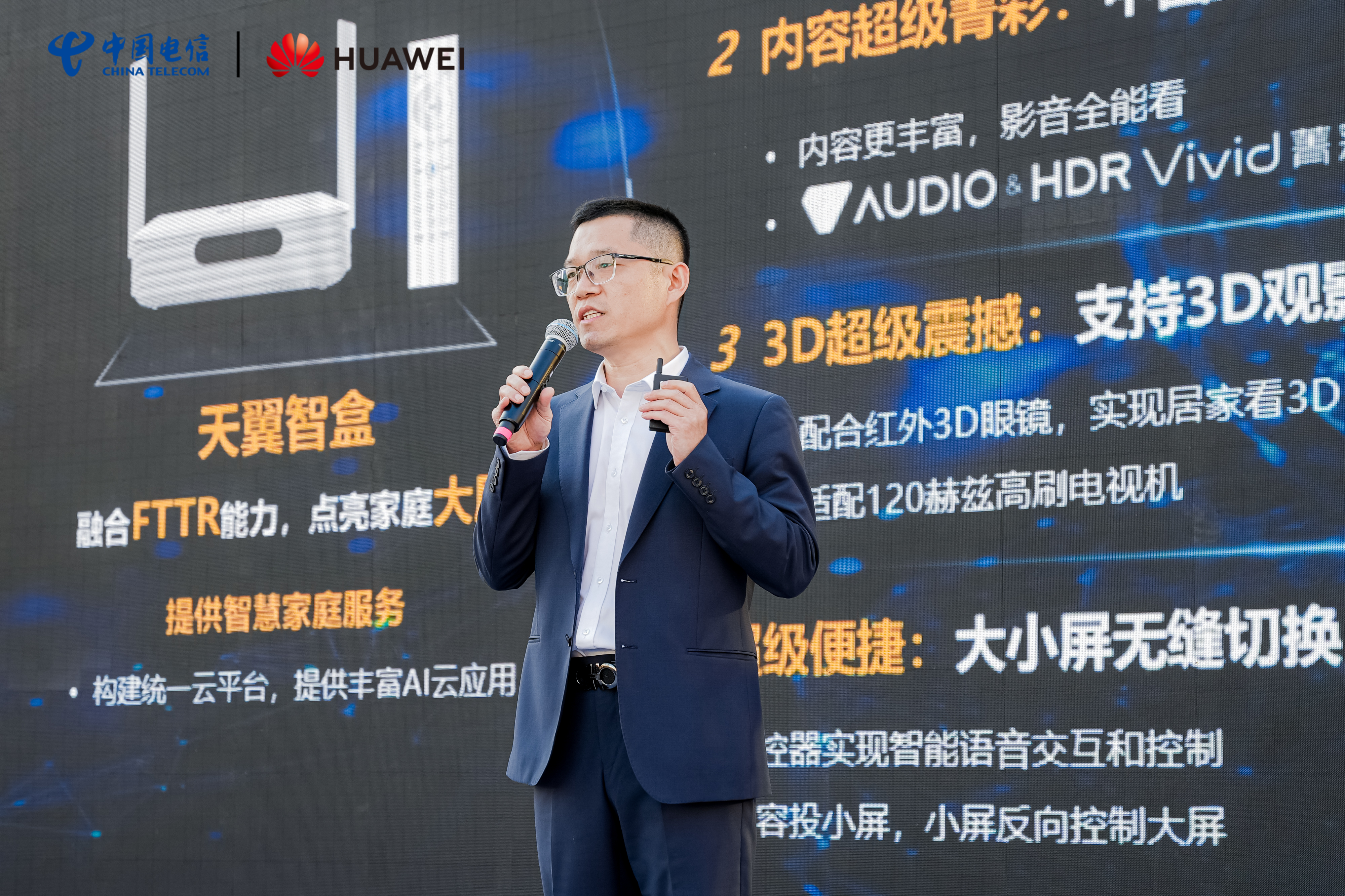 华为光产品线营销运作部部长孙国友在会上对天翼智盒的新品作了详细的介绍,他表示,天翼智盒集成了FTTR能力与AI智力,为用户带来四大革新功能: