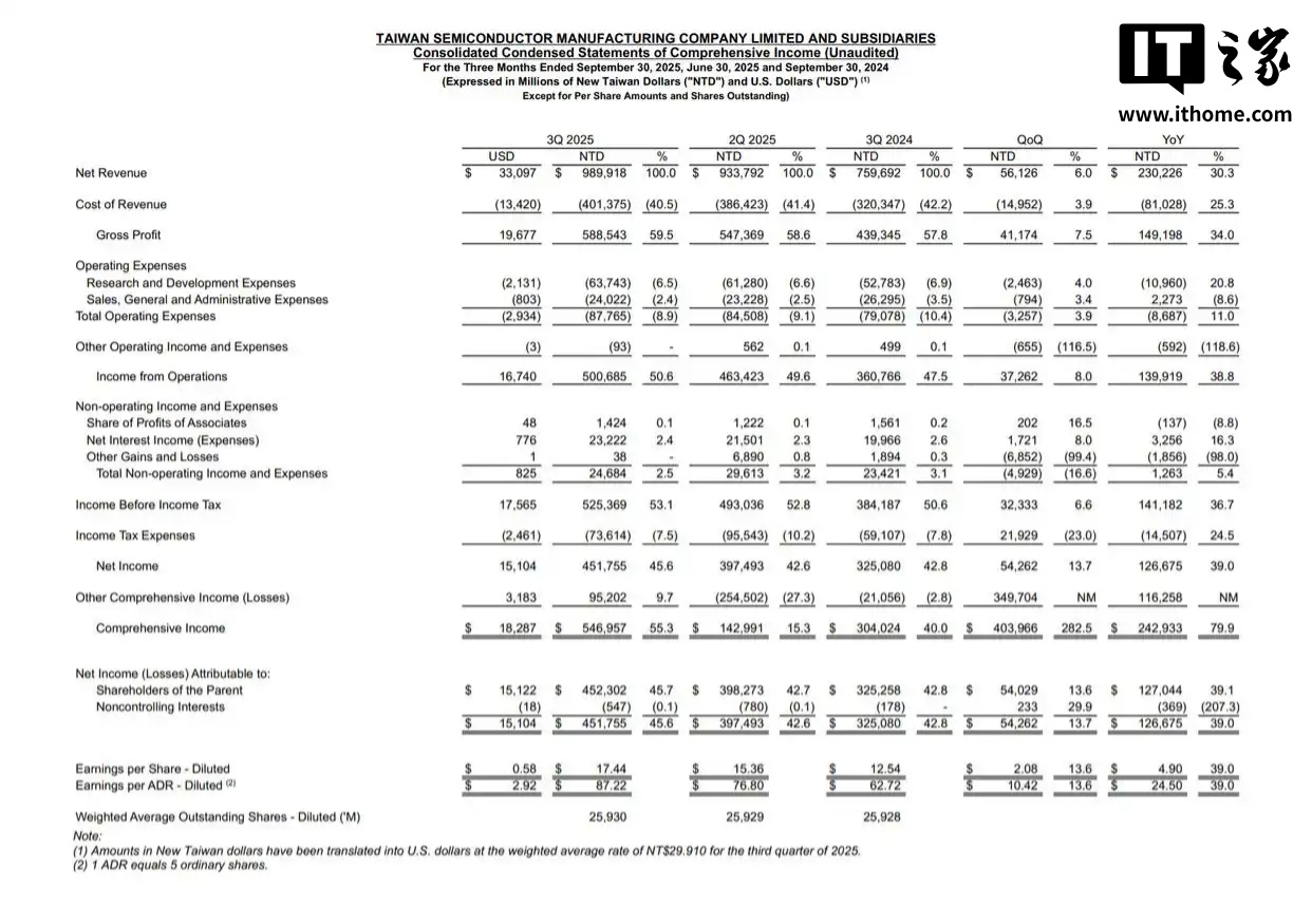 台积电今日公布了 2025 年第三季财务报告,公司三季度合并营收约 9899.2 亿元新台币(IT之家注:现汇率约合 2304.48 亿元人民币),同比增加 30.3%,净利润约 4523 亿元新台币(现汇率约合 1052.93 亿元人民币),同比增加 39.1%,每股盈余为 17.44 元新台币,同比增加 39.0%。