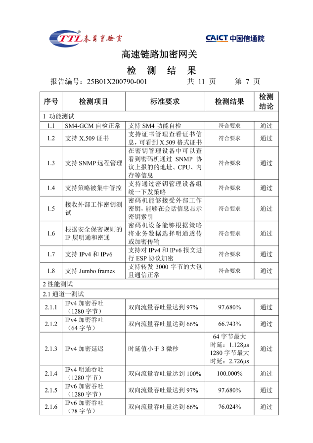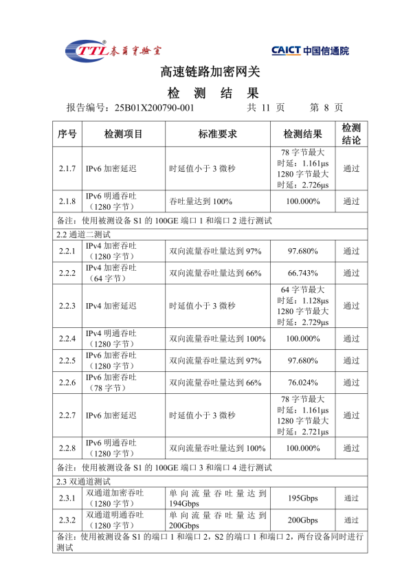 更关键的指标是“时延”。传统加密设备10-120毫秒的时延,而200G加密网关的平均加密时延低于3微秒(百万分之三秒),性能提升超过300倍,实现了安全防护的“零感知”,低时延能大大提高金融高频交易、智算中心等场景产业水平。