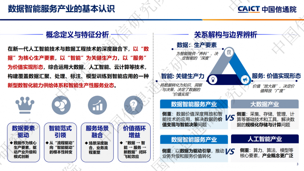 数据智能服务产业是在新一代人工智能技术与数据工程技术的深度融合下,以“数据”为核心生产要素,以“智能”为关键生产力,以“服务”为价值实现形态,综合运用大数据、人工智能、云计算等技术,构建覆盖数据汇聚、处理、标注、模型训练到智能应用的一种新型数智化能力供给体系和智能生产性服务业态。该产业呈现出数据要素驱动、智能范式引领、服务场景融合、价值循环增益四大显著特征。