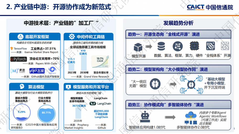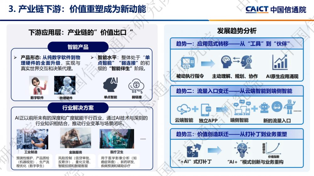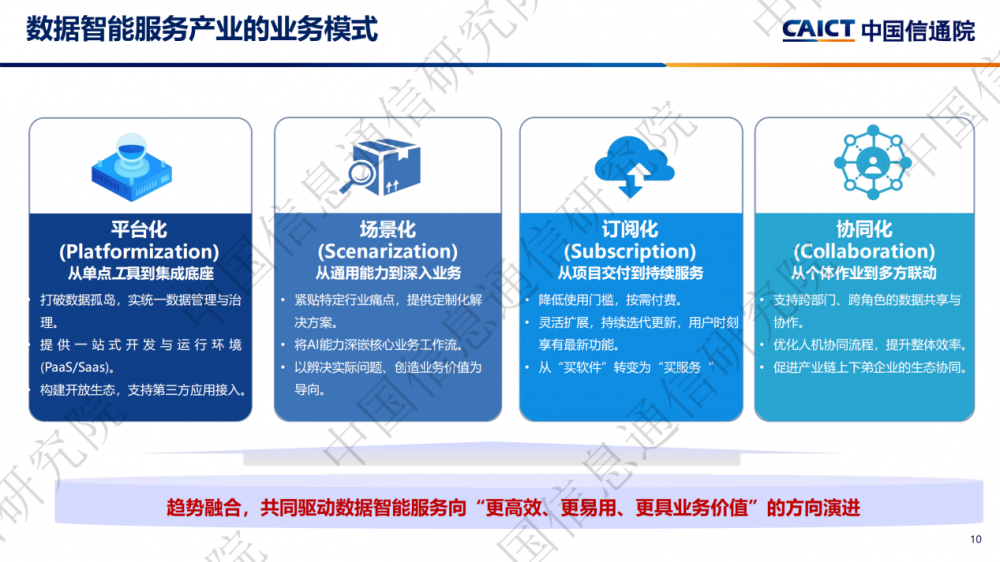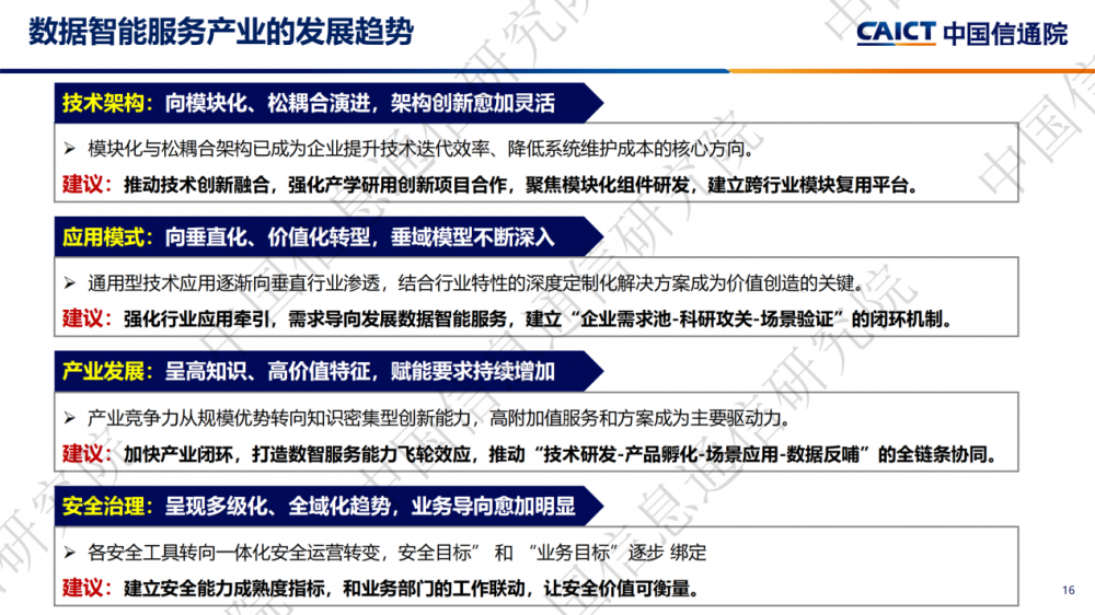技术架构将向模块化、松耦合演进,架构创新愈加灵活,应用模式将向垂直化、价值化转型,垂域模型不断深入,产业发展将呈现高知识、高价值特征,赋能要求持续增加,安全治理将呈现多级化、全域化趋势,业务导向愈加明显。