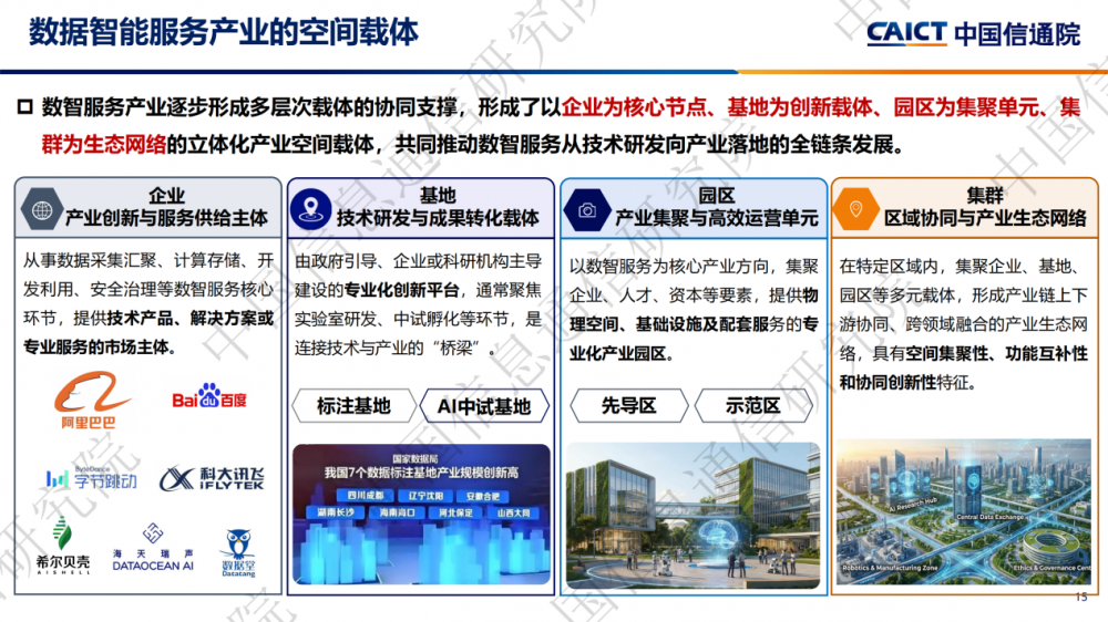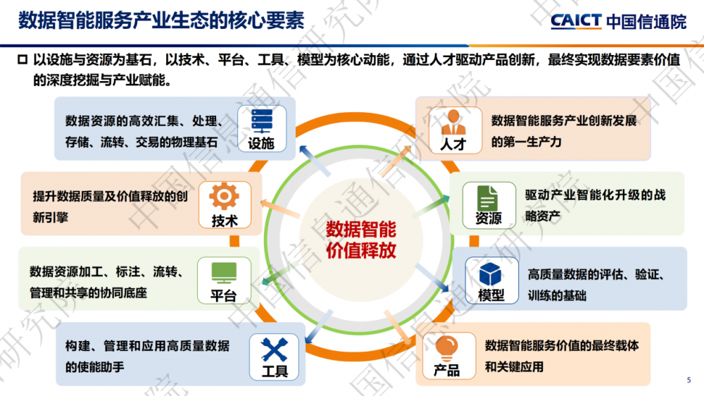 数据智能服务产业由设施、技术、平台、工具、产品、模型、资源、人才八大要素组成,其中以设施与资源为基石,以技术、平台、工具、模型为核心动能,通过人才驱动产品创新,最终实现数据要素价值的深度挖掘与产业赋能。