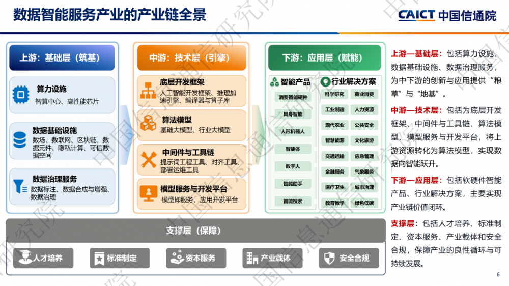 数据智能服务产业的产业链全景以“基础层-技术层-应用层-支撑层”为核心架构,涵盖数据基础设施、数据治理服务、底层开发框架、模型算法、多行业应用、产业载体等关键环节。在产业链上游,资源供给将崛起为新的战略高地;在产业链中游,开源协作正成为新的行业范式;而在产业链下游,价值重塑则成为驱动发展的新动能。