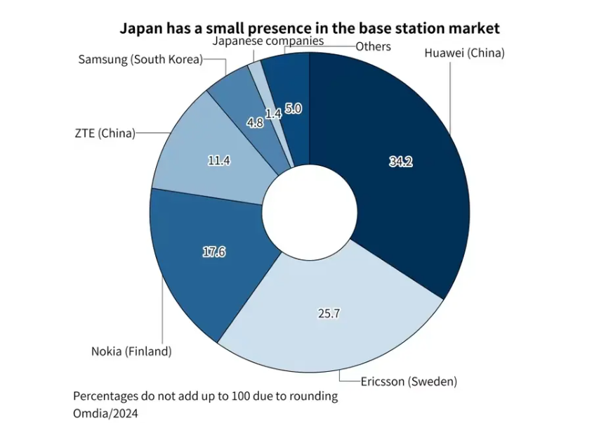 市场研究公司Omdia的数据显示,2024年全球RAN市场收入约为350亿美元,此前该市场已连续两年显著下滑。华为、爱立信、诺基亚和中兴通讯共同占据了2024年全球基站市场近89%的份额,而日本NEC和富士通的份额则不足1.5%。