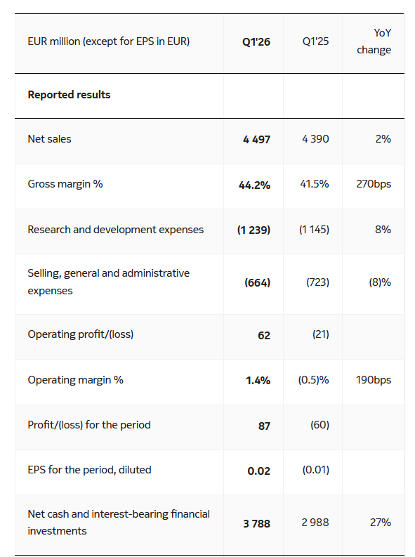 财报显示,2026年第一季度,诺基亚可比毛利率达45.5%,同比扩大320个基点。按国际财报准则计算,毛利率同比提升270个基点至44.2%。第一季度可比营业利润率同比增长200个基点,达到6.2%。按国际财报准则计算,营业利润率扩大190个基点至1.4%。第一季度自由现金流为6亿欧元,净现金余额为38亿欧元。