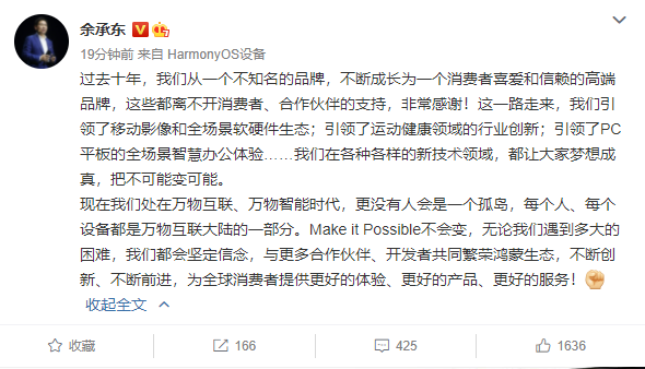 发布会结束后,余承东深夜发文感谢所有用户,是他们帮助华为在这十年里从一个不知名品牌走向引领业界,把不可能变可能。