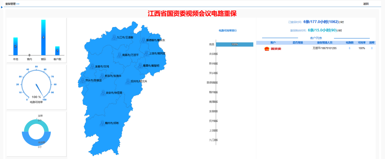 4月22日起,江西联通即全方位、全环节对重保电路上墙监控管理,专人7X24小时监控运行状况。会议当天,派驻网络维护及优化工程师等重保团队现场值守,确保了会议系统及周边移动网络的整体通信畅通,省国资委对江西联通“匠心网络、出色重保”给予高度赞扬,与会代表对“云签约”、“屏对屏”会议创新给予高度评价。