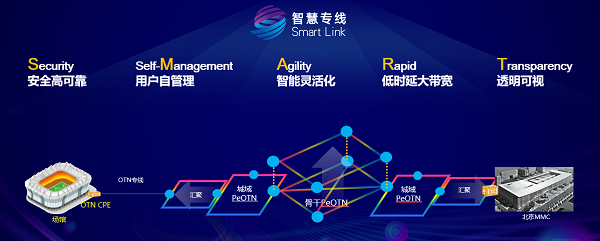 北京联通“Smart Link”智慧专线是全球首款基于PeOTN光网络和智能管控平台iMaster NCE的高品质政企OTN专线产品,具备“Smart”特性(Security高安全高可靠;self-Management用户自服务;Agility灵活智能运维;Rapid低时延大带宽;Transparency状态透明可视)的高品质专线服务。