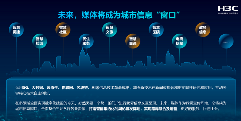 一网融合、智能推荐、高效阅览……在百行百业全面实现数字化建设的今天,需要一个统一的门户进行跨界信息交互呈现。新华三集团此次为媒体行业重点打造的智媒云解决方案将通过全栈智能能力,全力加速媒体业务平台升级与应用落地,成为信息互通的窗口。