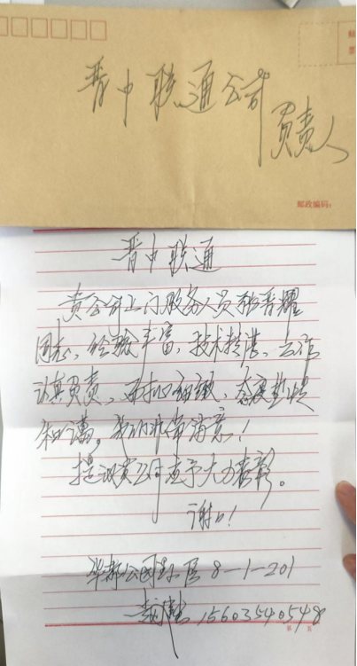 今年6月21日夏至,当日气温高达36度,一位老大爷冒着炎热高温来到晋中联通,进门就说“我今天是要感谢你们联通,表扬你们的维修员!”待坐下来,老人家慢慢讲述了他心中的感动。