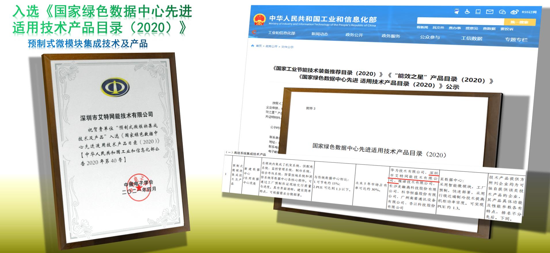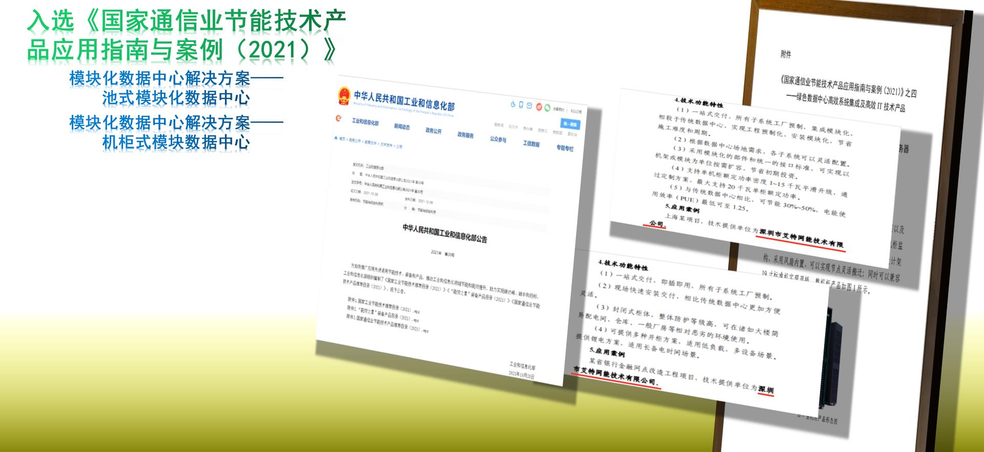 其中,艾特网能预制式微模块集成技术及产品于2020年入选工信部《国家绿色数据中心先进适用技术产品目录(2020)》,机柜式模块数据中心、池式模块化数据中心于2021年再次入选工信部《国家通信业节能技术产品应用指南与案例(2021)》。