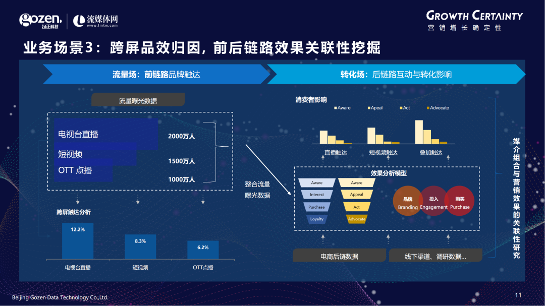 第三个是跨屏品效归因, 前后链路效果关联性挖掘。比如客户给到需求,我们会有IP、传统电视台、短视频、OTT的投放。在这个基础上,我们会测算整体流量曝光数据。然后再分别计算跨屏的触达分析、各媒体的贡献情况。还会看电商后链路转化,去了解什么样的人在什么样的场景下会产生什么样的电商转化情况。