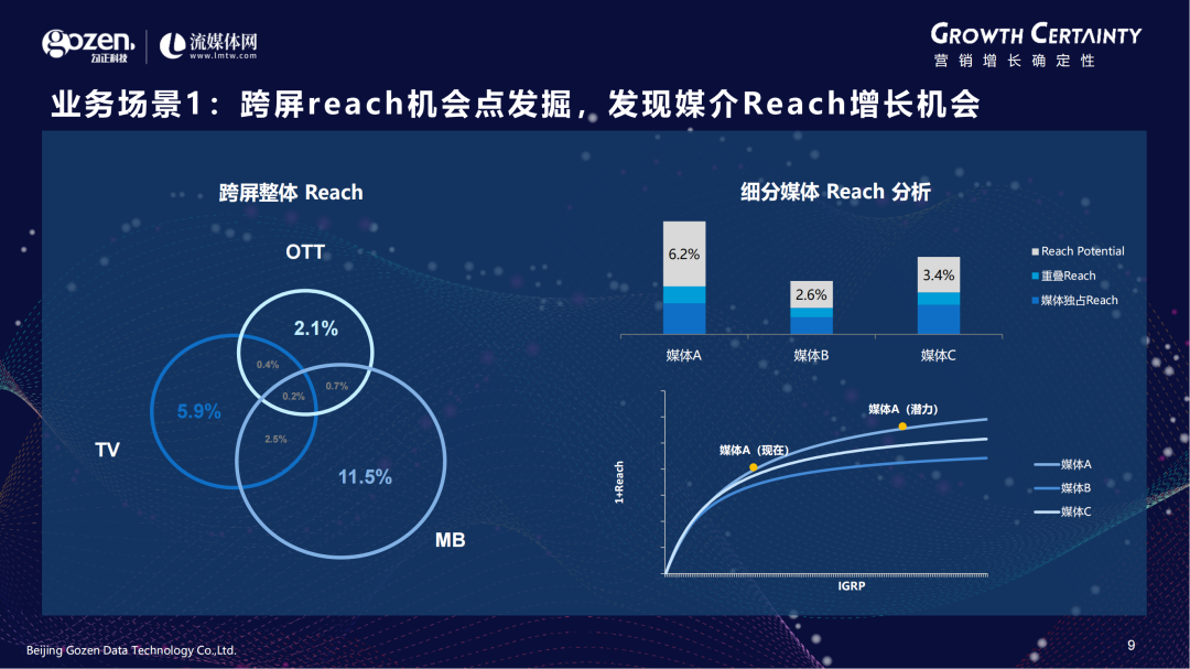 第一个是跨屏Reach机会点发掘,发现媒介Reach增长机会。跨屏整体Reach数字是真实的,但是我们可能没有办法告诉客户OTT、TV或MB的占比,还有多少的增长空间。现在我们可以进行细分媒体Reach分析,看到拐点在哪,是否还有爬升的空间。