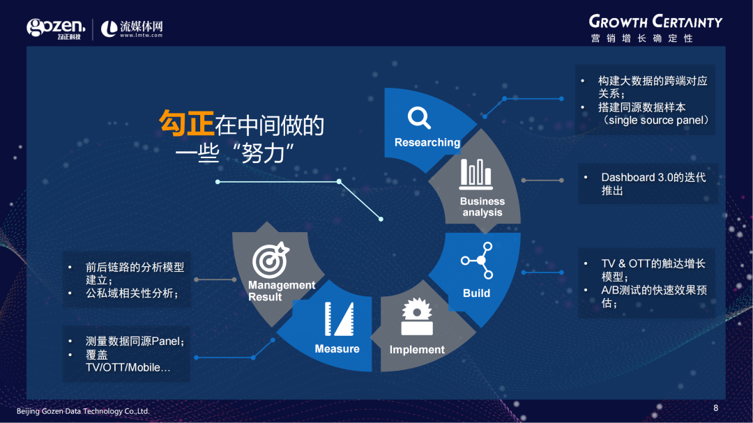 对于这些痛点,勾正科技过去几年也在做一些努力,比如在Researching环节,构建过亿的跨端对应关系,搭建同源数据样本(single source panel);Business analysis环节,有Dashboard 3.0的迭代推出;Build环节,打造TV&OTT的触达增长模型,实现A/B测试的快速效果预估;Measure环节,测量数据同源Panel,覆盖TV/OTT/Mobile…;Management Result环节,建立前后链路的分析模型,进行公私域相关性分析等。