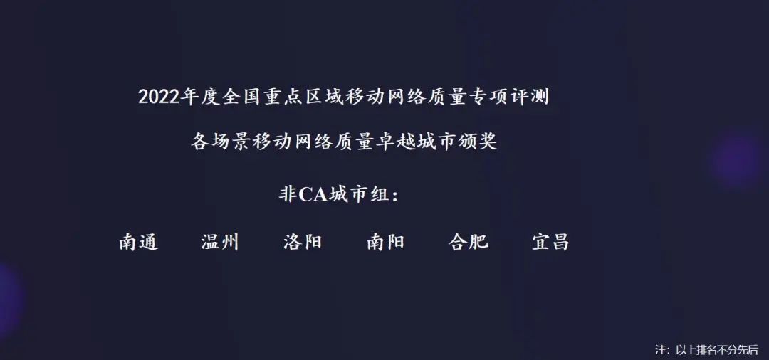 湖北移动宜昌分公司荣获“各场景移动网络质量卓越城市(NCA组)”奖项,湖北移动武汉、襄阳分公司亦在校园、公园、商场等场景测试中获得前五名的优秀成绩。