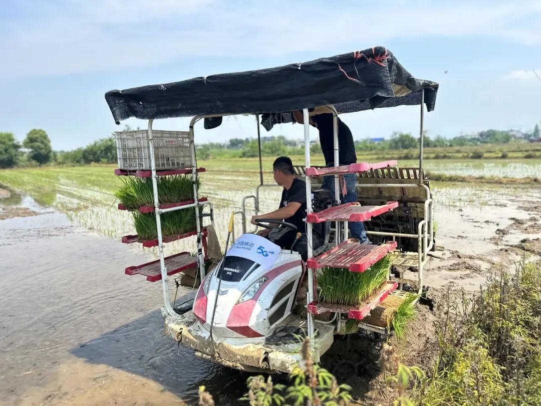 在湖北移动“5G+北斗”高精定位技术支撑下,插秧机栽插的秧苗行行笔直,1机1天能完成30-50亩作业面积,不仅省时省力,还节省了播种成本。