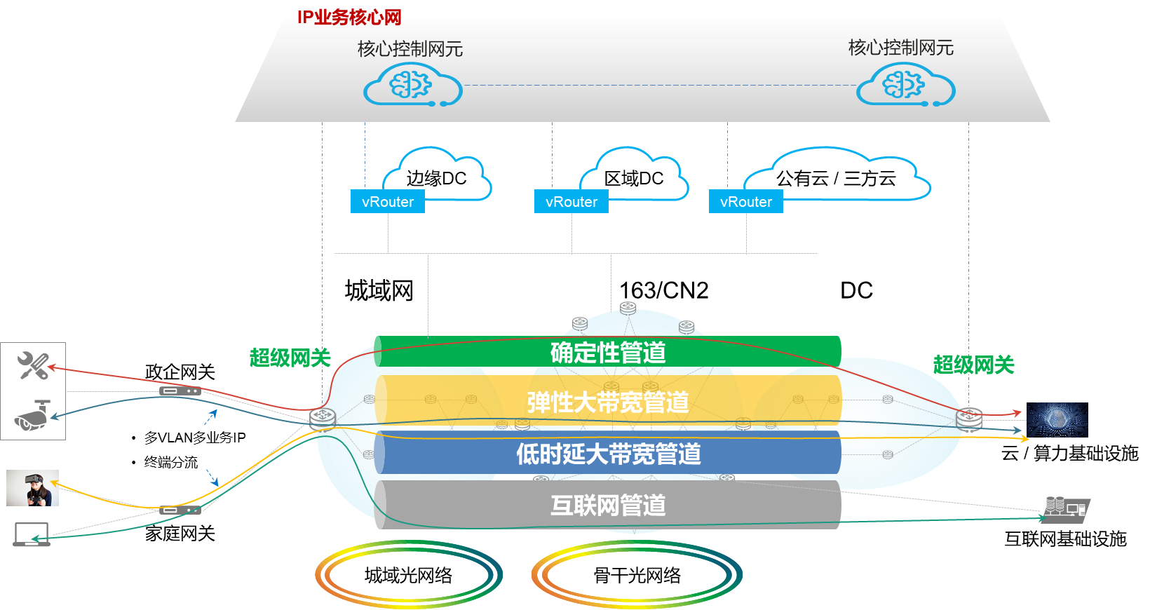 算力快线赋能建成高性能计算互联网:通过构建广域业务网,算力快线将还是一个个孤岛的各高性能计算中心连接起来,形成完整生态,建成虚拟化、一体化的高性能计算互联网,基于此,海量数据跨域从高性能计算中心传输到高性能计算用户,通过IP业务网实现全链路网络控制、保障确定性服务。业务网可以根据用户藉由门户下达的订购指令建立端到端保障连接,提供差异化服务,满足自助服务、参数随选、随建随拆、安全可信的连接需求。