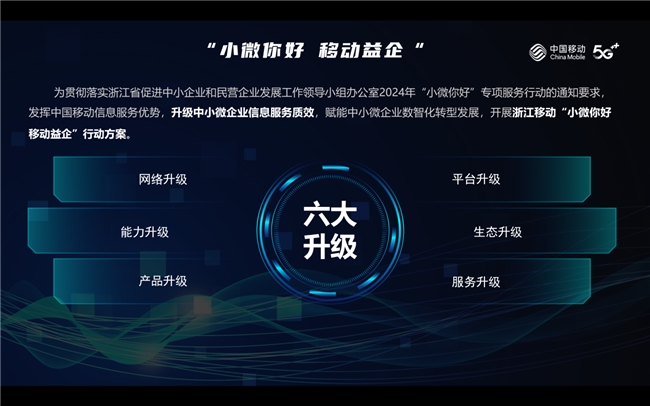 中国移动浙江公司高度重视中小微企业数字化转型发展,通过强化顶层设计,夯实数智底座,建强六大能力,系统构建中小企业服务体系。据悉,2023年在浙江省经济和信息化厅指导下,中国移动浙江公司联合开展了“小微你好 移企同行”主题活动,活动取得良好的成效。2024年,再度起程“小微你好”专享服务行动,依托资源禀赋优势、以“六大升级”为抓手的《小微你好 移动益企》行动方案,全年目标服务中小企业10万家,惠企减费1.5亿。
