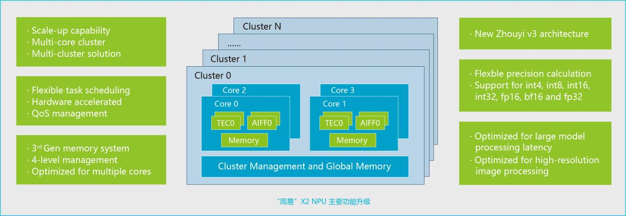 如果说“周易”X1是稳健的奠基者,那么“周易”X2则是强大的开拓者。基于更先进的第三代“周易”架构,“周易”X2 NPU实现了算力的巨大跃升。它支持多核集群,可构建最高达320TOPS的子系统,足以应对更复杂、更庞大的神经网络模型。