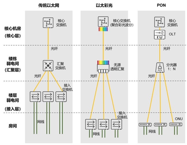 换言之,以太彩光方案在集成了以太网协议及优势的基础上,充分融入了光通信的优势,通过一根单芯光纤,即可实现从核心到多个接入点的直连架构。