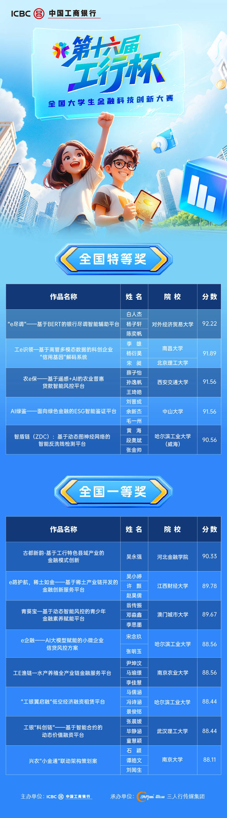 作为中国特色世界一流现代金融企业的杰出代表,工商银行始终将支持教育事业、服务国家战略置于核心位置。“工行杯”历经十六载春秋,已成为高等教育领域具有品牌价值和示范效应的标杆赛事,并成功入选《全国普通高校大学生竞赛分析报告》目录。