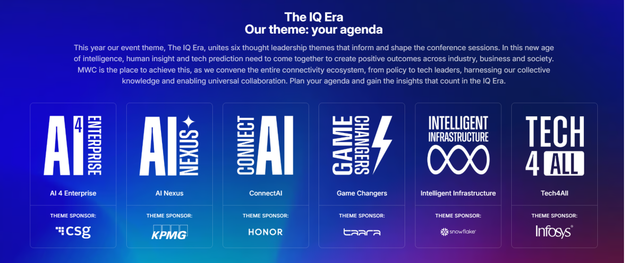 2026年3月2日-5日,MWC2026以“The IQ Era(智能新纪元)”为主题登陆巴塞罗那Fira Gran Via展馆,AI作为核心驱动力,围绕企业人工智能、智能连接、智能基础设施等六大前沿议题,汇聚全球科技力量共探智联产业未来。