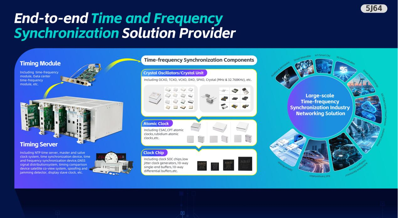 时间频率同步领域也是赛思本次参展的核心亮点,全产业链端到端解决方案重磅亮相,覆盖全品类元器件与系统设备。展品包含OCXO、TCXO等全系列晶振,其中超低抖动差分晶振是近期重磅发布的新产品,支持25MHz~625MHz宽频率范围,156.25MHz下实测抖动值低至44fs,为高算力AI设备、5G-A/6G基站提供极致时钟精度。同时,铷原子钟、CPT原子钟等高精度原子钟,时钟SOC芯片、PCIE授时模块等核心产品,以及NTP/PTP时间同步服务器、授时安全防护装置、光纤频率级联传递设备等时钟系统产品同步亮相,可全方位满足电力、数据中心、卫星通信等核心场景的时频同步需求。