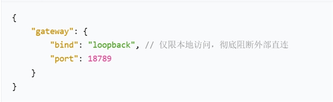 操作策略:修改配置文件 ~/.openclaw/openclaw.json,将网关绑定至本地回环地址。