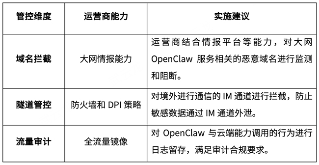 • 疏:推出“运营商认证版OpenClaw发行版”,预置安全加固、集成网络认证、提供技能市场安全托管,接入备案大模型,将开源创新纳入安全合规轨道。