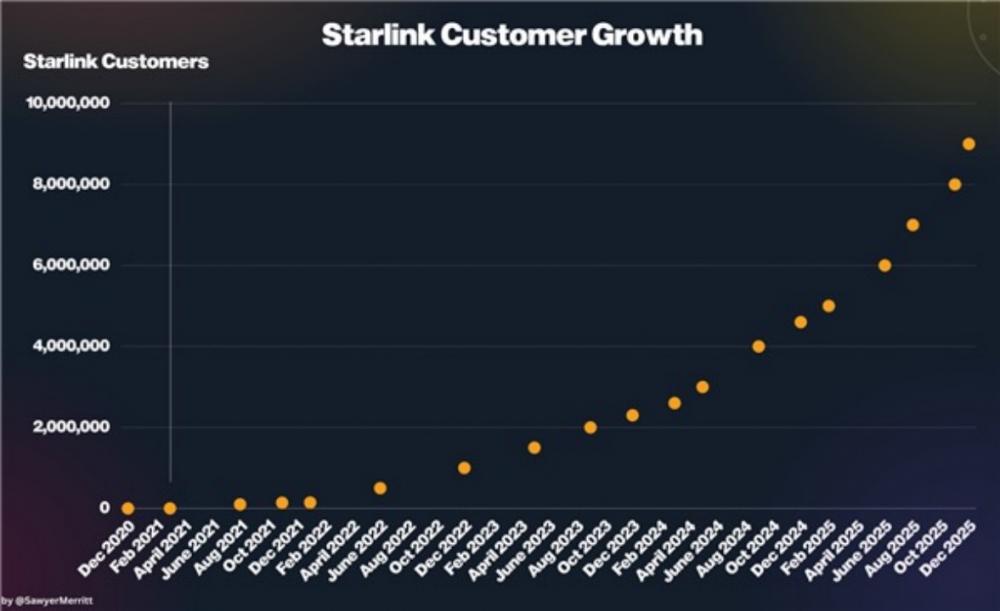 2025年成为星链的“爆发之年”:2月突破500万,6月达600万,8月升至700万,11月迈入800万,12月22日便突破900万,最终实现47天新增100万的增速记录。按照当前增长轨迹,行业普遍预测星链有望在2026年初突破1000万用户里程碑。