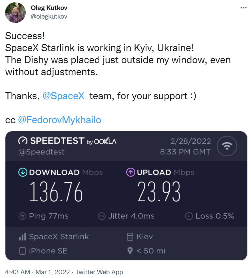 报道称,乌克兰的一位用户目前已对 Dishy V1 星链设备进行了速度测试 —— 持续速度 136 Mbps,最高速度 200 Mbps。这几乎是当地平均速度的 5 倍。
