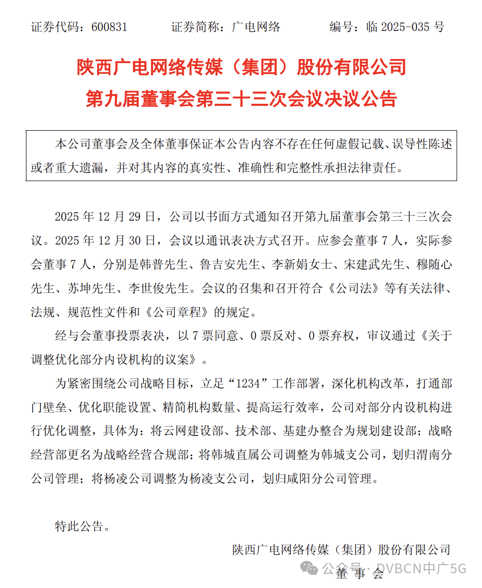 近日,陕西广电网络传媒(集团)股份有限公司召开第九届董事会第三十三次会议,审议通过《关于调整优化部分内设机构的议案》。