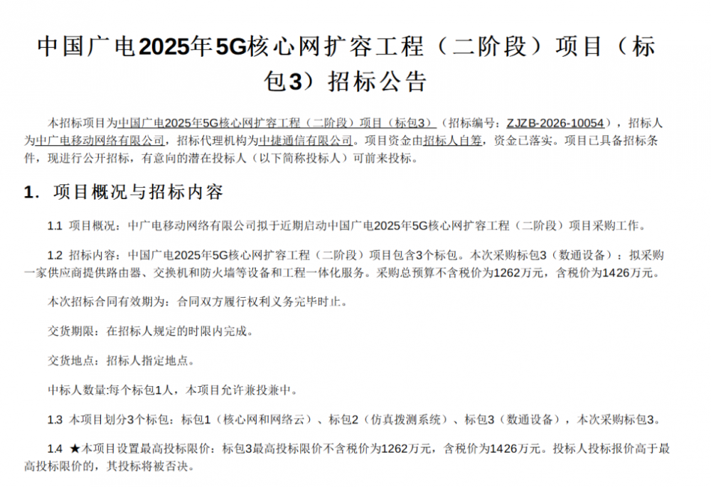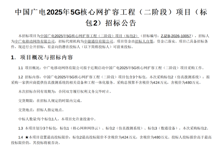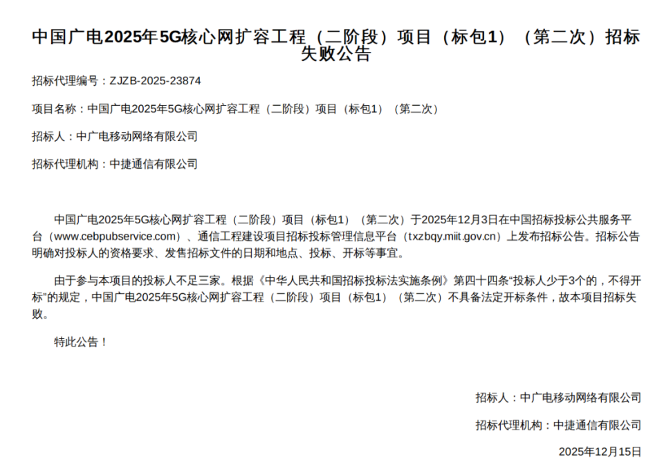 中国广电2025年5G核心网扩容(二阶段)标包2、3启动招标 此前包1两次流标